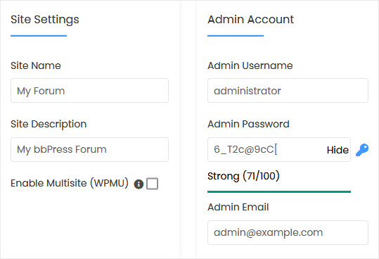 • Admin Username: Your new bbPress username (for security reasons, do not use the administrator or the admin username).